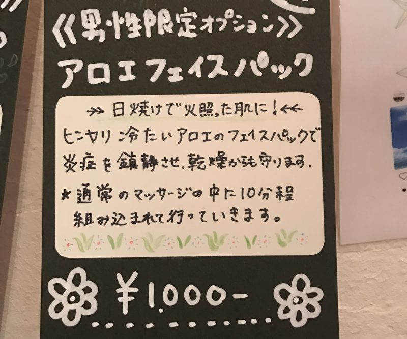 男性限定で通常のマッサージに、アロエフェイスパックを組み合わせることもできます。