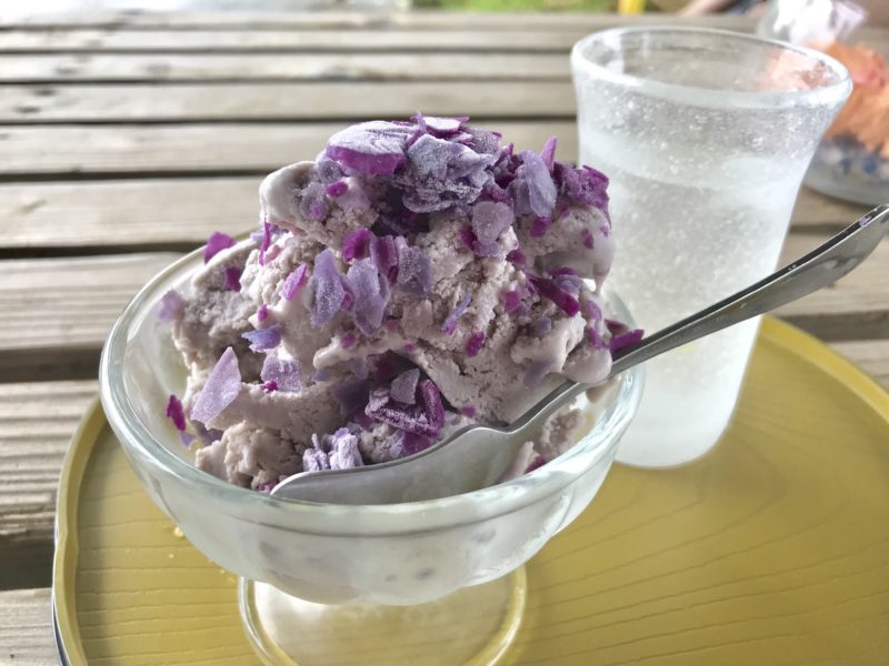 アイスの上には凍らせた紅芋と沖夢紫という芋が散りばめられていて