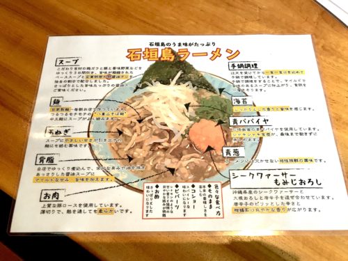 こちらがメニューです。ぱっと見て目を引く石垣島ラーメンの文字。