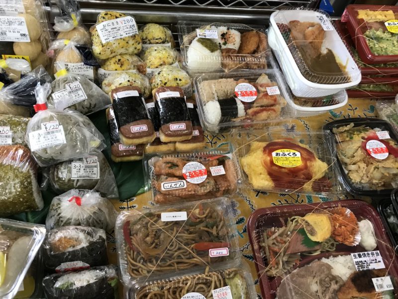 スパムおにぎりや八重山そばを使った焼きそばなど、珍しい種類の軽食やお弁当が並んでいます。